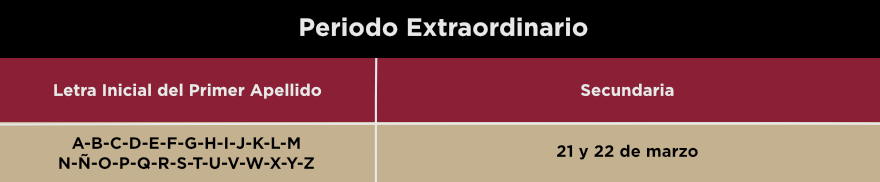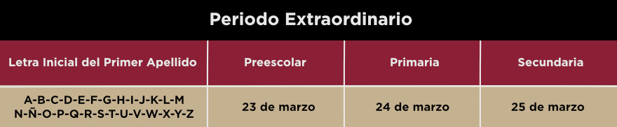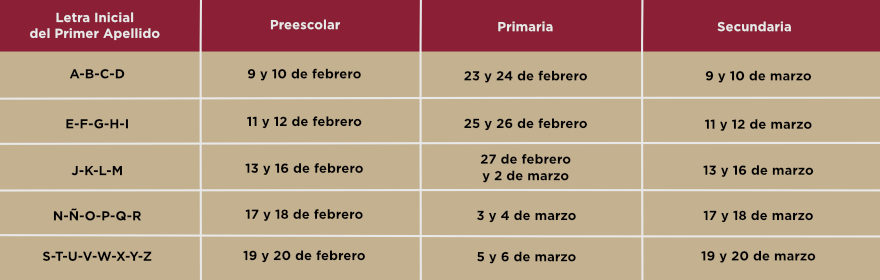 El periodo de preinscripción será del 9 de febrero al 20 de marzo de 2026, por nivel educativo, conforme a la letra del primer apellido como se muestra en la tabla siguiente: